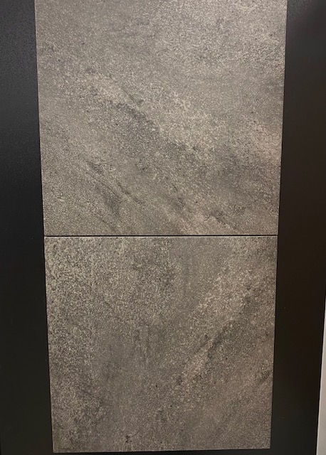 Tummanharmaa luonnonkiveä jäljittelevä lattia- ja seinälaatta.